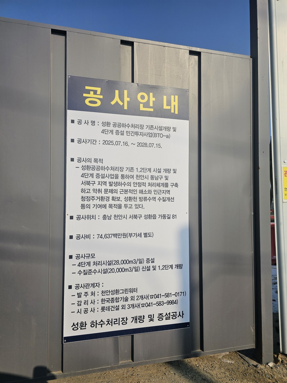 358. (천안성환그린워터(주)) 천안 성환하수처리장 개량 및 증설(BTO-a) 중 증설구간 세라믹 방수 방식 공사 페이지 정보 작성자최고관리자 댓글 0건 조회 1회 작성일 26-01-23 11:10 본문 ■ 발주처: 천안성환그린워터(주)■ 시공사: 롯데건설(주)(2025년 12월 착공) 목록 이전글359. (강원도홍천군) 홍천군 풍암정수장 현대화 및 증설사업 중 세라믹 방수 방식 자재납품 26.01.23 다음글357. (강원도 양구군 상하수도사업소) 해안 공공하수처리시설 및 하수관로 정비사업 중 세라믹 방수 방식 공사 25.12.03
